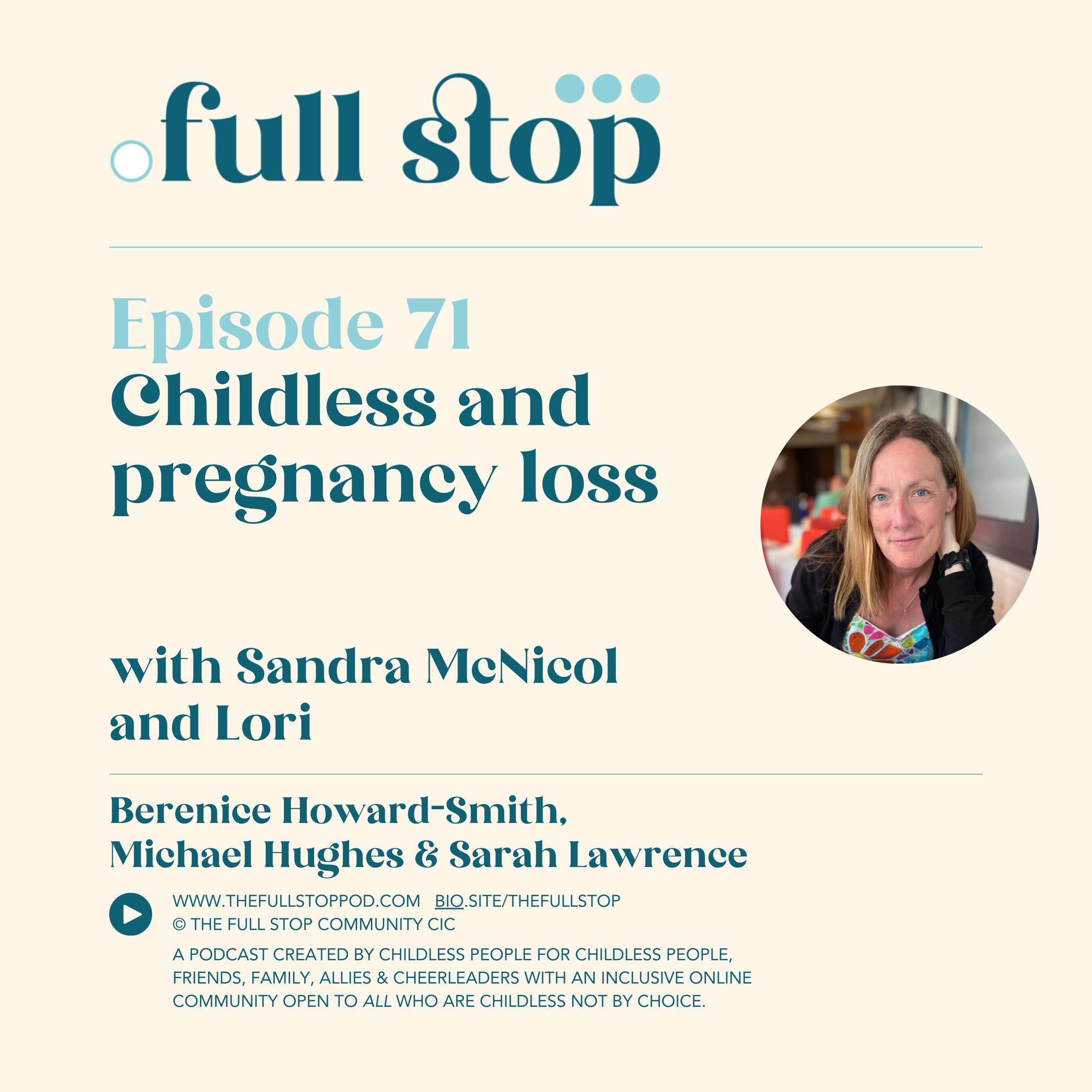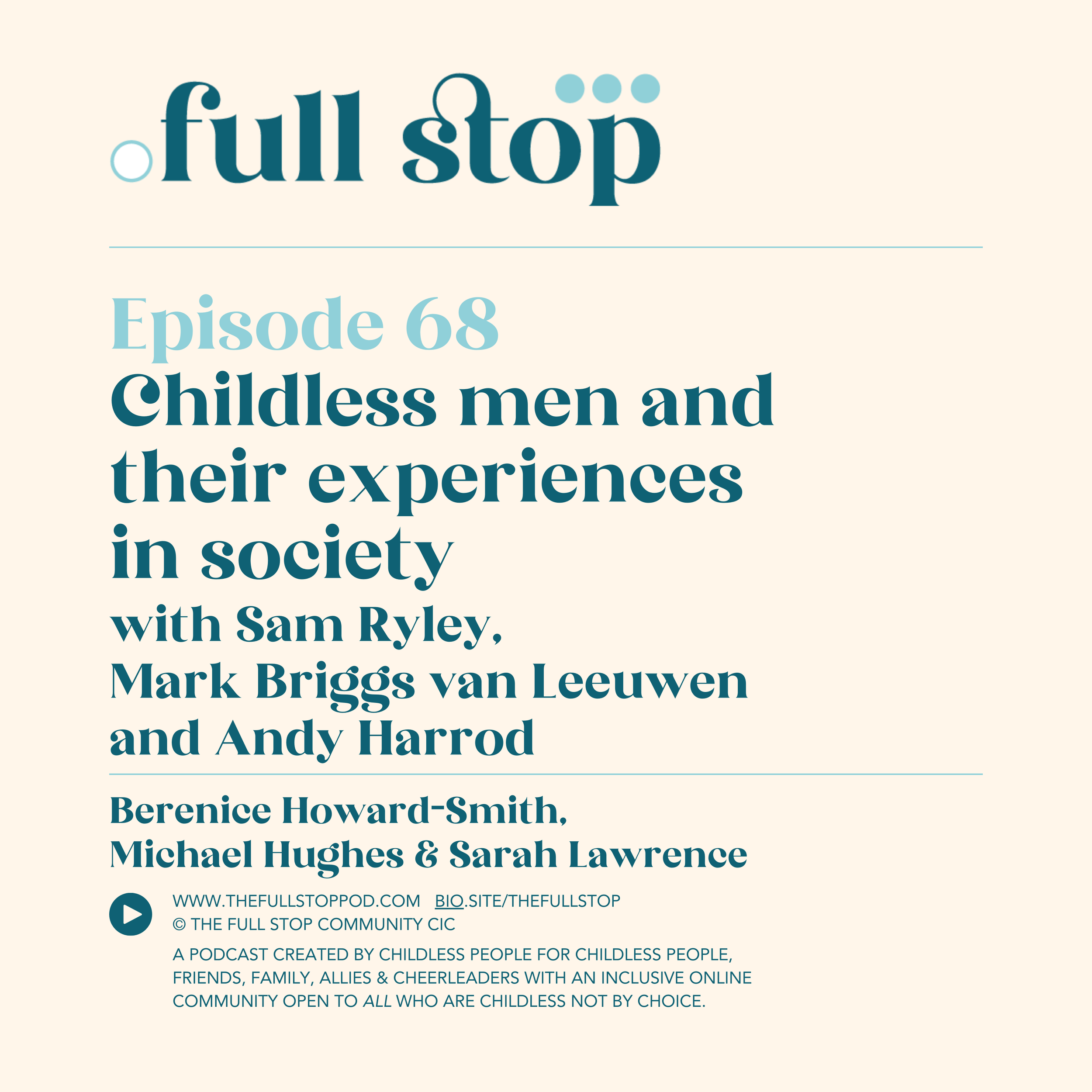 The Full Stop Community CIC aims to provide accessible episodes for those who are childfree (by choice) and colleagues, family and friends of anyone who is childless not by choice. We welcome parents to our audience and aim to be informative so they can stand alongside us with more knowledge and understanding. We do not seek to devalue parents, since being childless is hard, and so is being a parent but we will endeavour to represent those who are involuntarily childless at every opportunity.